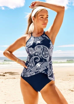 Cross Strap Navy Blue Paisley Print Tankini Set